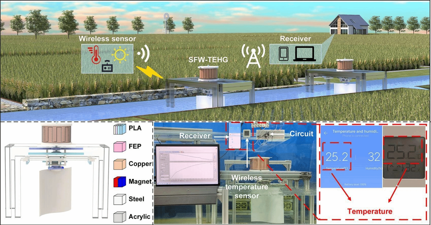 针对低速水流能俘获困难的问题,团队提出了一种萨伏纽斯扑翼式摩擦-电磁复合发电机(SFW-TEHG),利用萨伏纽斯扑翼低启动流速和高升力的优点,通过萨伏纽斯扑翼的往复扑动实现对低速水流能量的有效收集。搭建了自供能无线传感系统,通过SFW-TEHG为该系统供电,实现对温度、光照强度等环境参数的无源监测。本研究提出的SFW-TEHG在为物联网小型传感器供电方面有良好的应用前景,并为低速水流能俘获提供了新的解决方案。该成果以“Triboelectric-electromagnetic hybrid generator with Savonius flapping wing for low-velocity water flow energy harvesting”为题发表于能源领域国际顶级期刊《Applied Energy》(IF=11.4)。我校博士生张加诚为第一作者,武汉科技大学为第一单位,王中林院士、程廷海研究员和朱建阳教授为共同通讯作者,蒋林教授为论文共同作者。