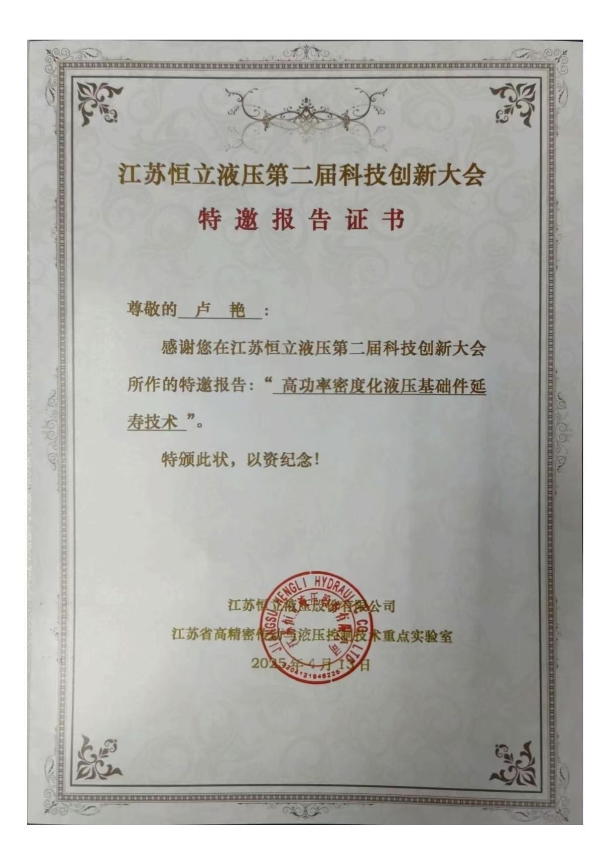 2025年4月13日,开云官方网页版官网机械电子工程系卢艳教授,受邀参加江苏恒立液压第二届科技创新大会并作特邀报告:“高功率密度化液压基础件延寿技术”。